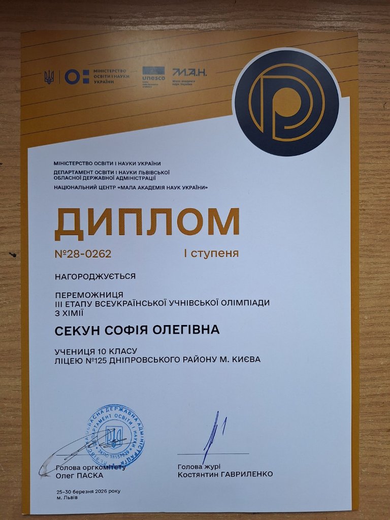Вітаємо СОФІЮ СЕКУН із блискучим результатом на Всеукраїнській олімпіаді з хімії 2026 року – ПЕРЕМОГОЮ – Дипломом І ступеня!